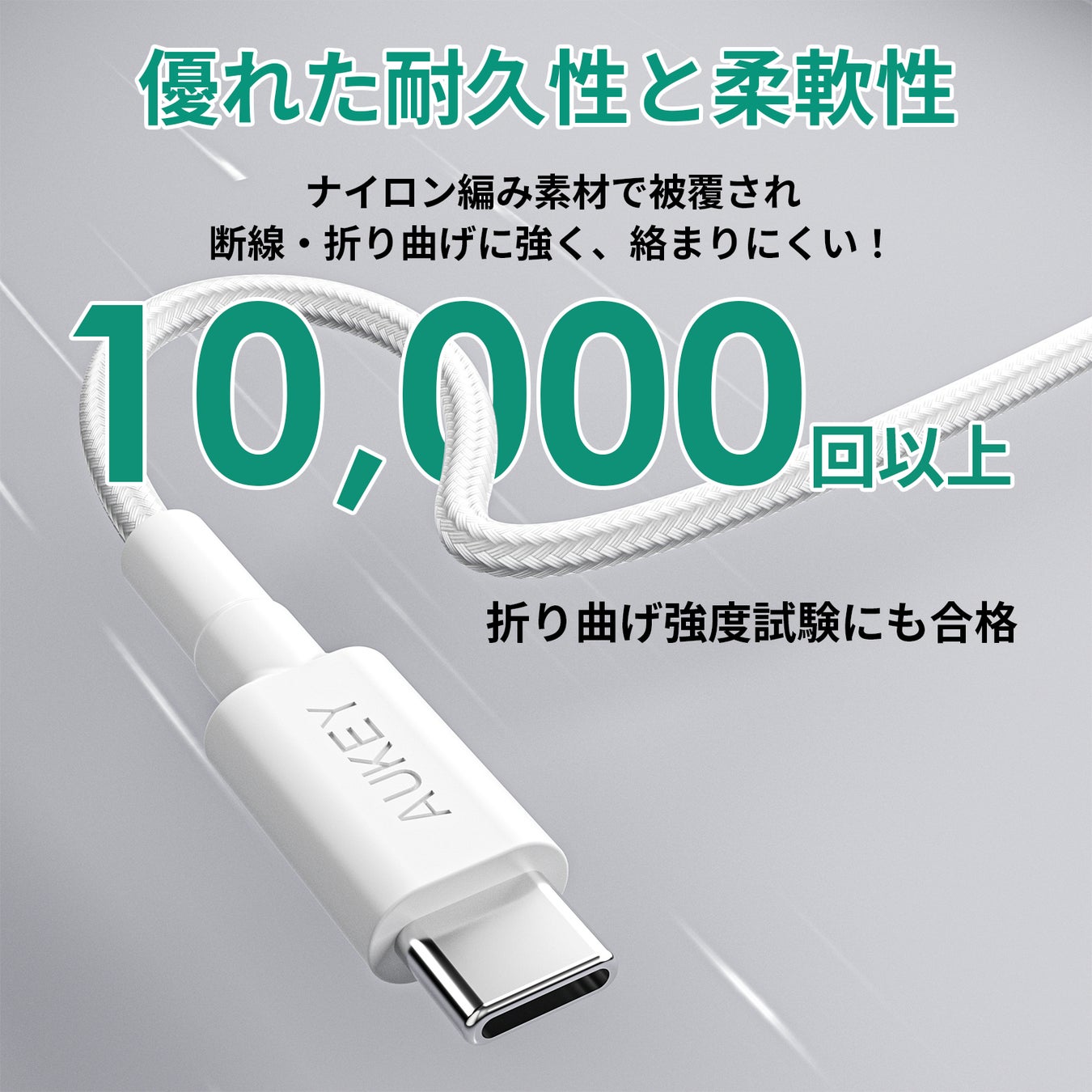 本製品のケーブルは耐久性に優れた編組ナイロンで外装され、なめらかな手触りで高級感のある外観です。抜群の柔軟性と耐久性があり10,000回以上の折り曲げ強度試験にも合格しています。からまりにくく折り曲げにも強く、断線しにくい製品です。