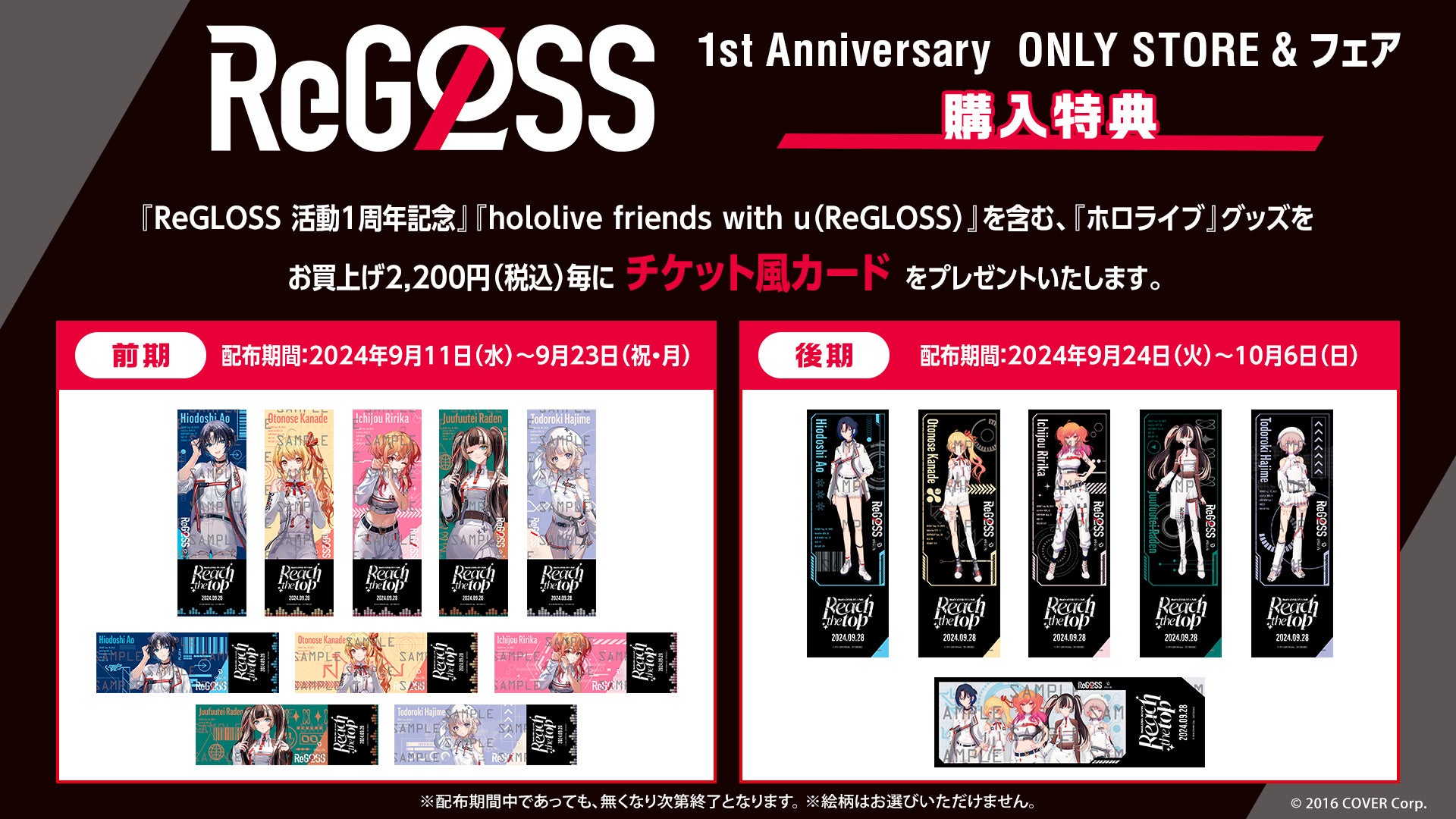 『ReGLOSS 活動1周年記念』『hololive friends with u(ReGLOSS)』を含む、『ホロライブ』グッズをお買上げ2,200円(税込)毎に チケット風カード をプレゼントいたします。