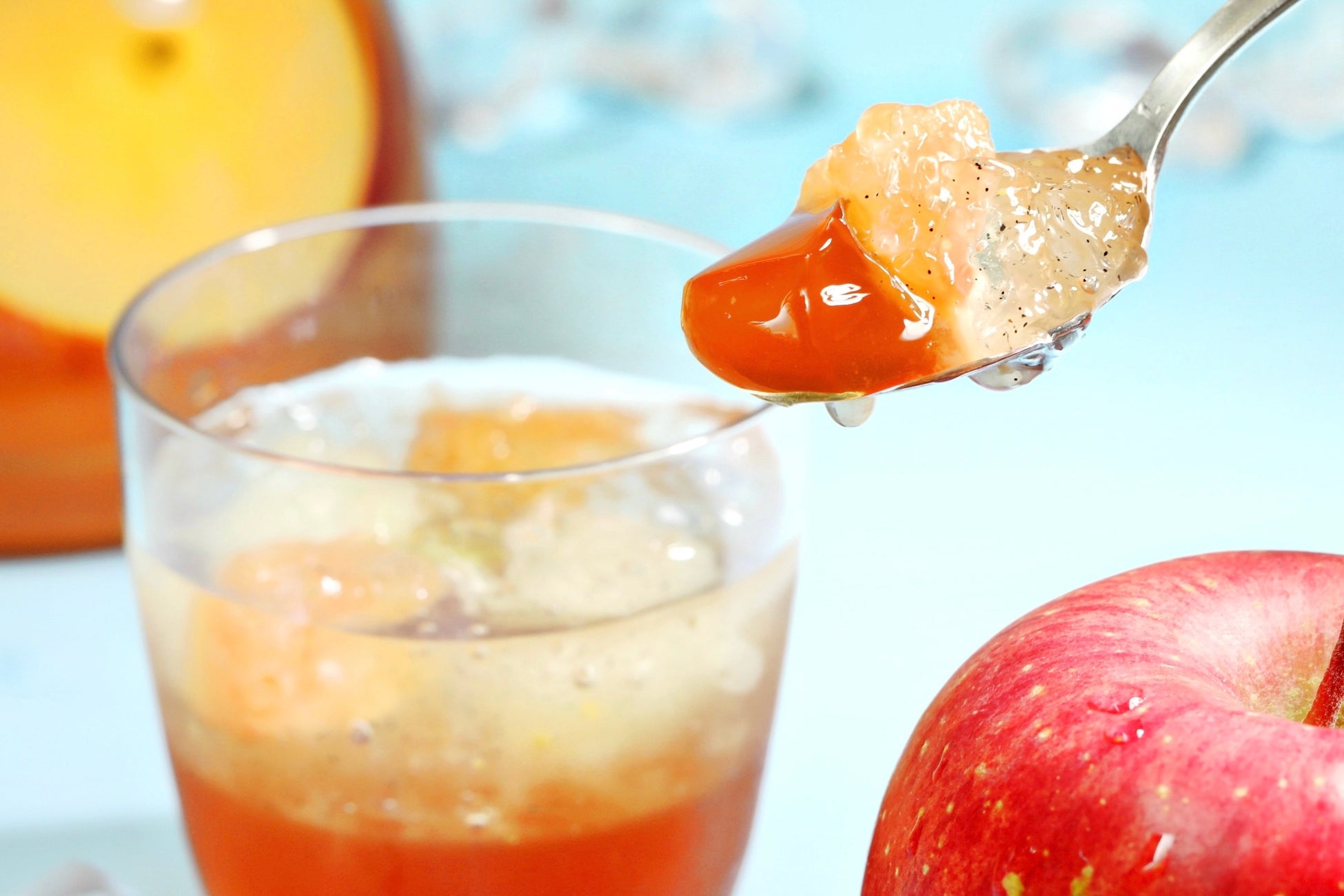 こだわり:なめらかな食感のアップルティーゼリーに、きらきらと透き通る柚子風味のゼリーと2種類