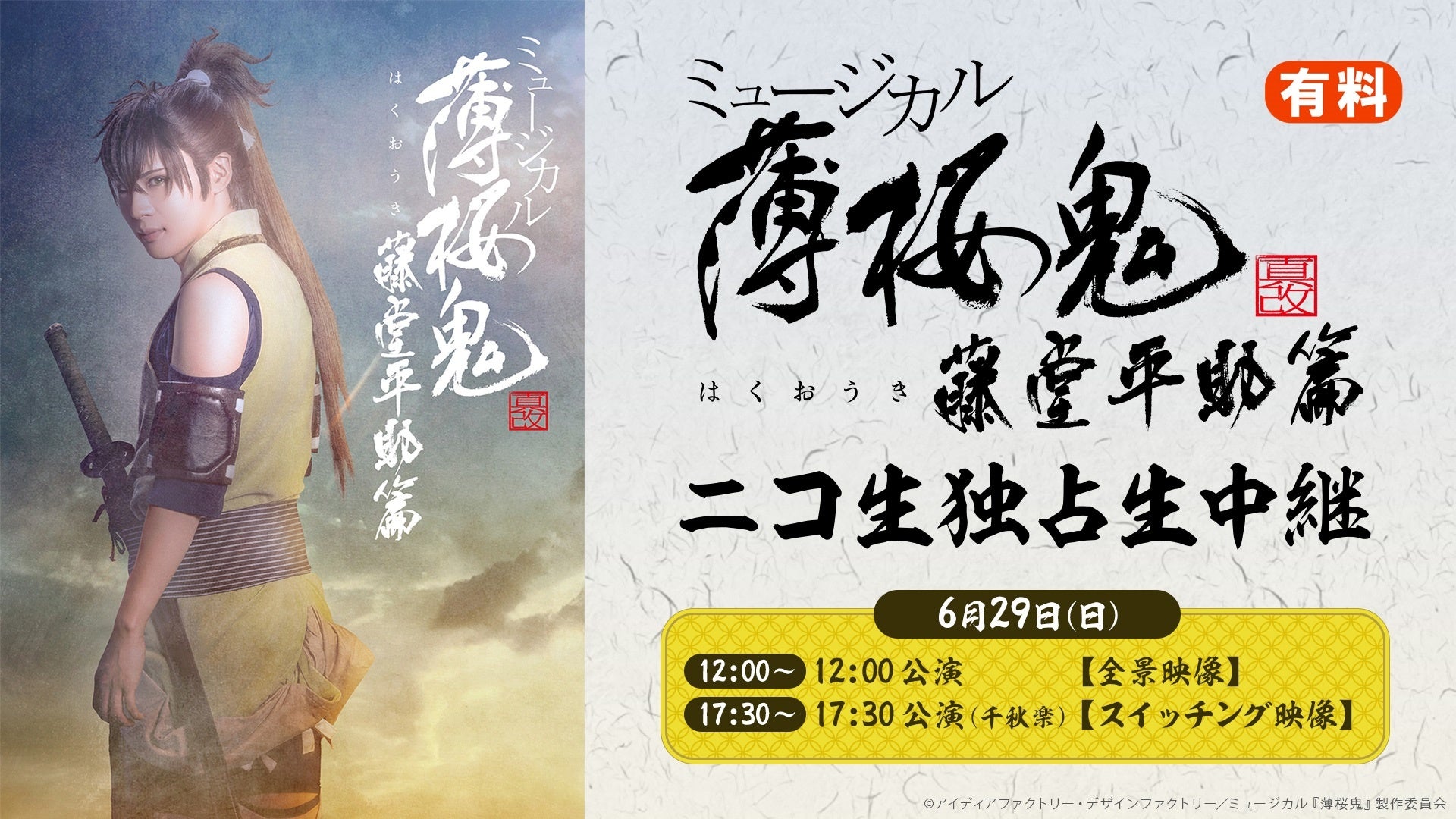 ニコニコ生放送では、6月29日(日)12:00公演・17:30公演(千秋楽)の独占生中継が決定いたしました。