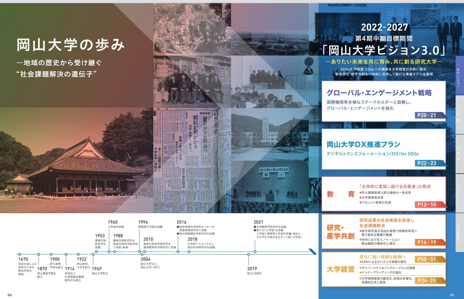 様々なステークホルダーの皆様に、岡山大学の掲げるビジョンからそこに向けた戦略と、これまでの実績をわかりやすく説明しています。このたび、最新号となる「岡山大学統合報告書2022 Pay it Forward」を2022年11月30日に発行しました。この機会にぜひご覧ください!