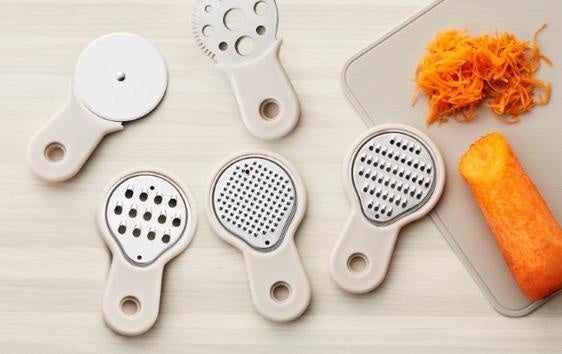 削る部分が短く、食べやすい一口サイズの千切りができます。太めの千切りができるタイプやミニ薬味おろし、ミニピザカッターなどもお取り扱いがあり、プチプラのため気軽に揃えることができます。