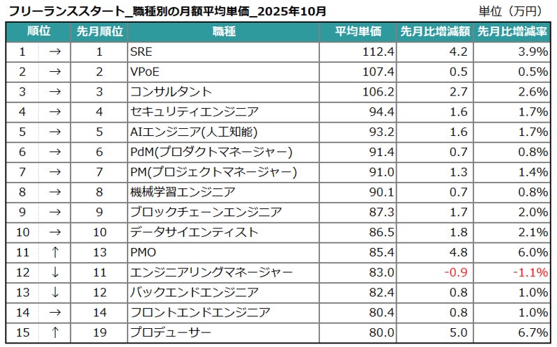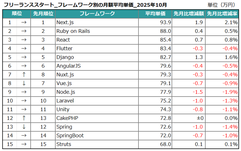 エン株式会社(本社:東京都新宿区、代表取締役会長兼社長:越智通勝)が運営するフリーランスエンジニア向け案件検索エンジン『フリーランススタート』(https://freelance-start.com/)では、サイトに掲載されたすべての求人の情報を集計し、分析を行なっています。2025年10月度の集計結果がまとまりましたので、お知らせします。