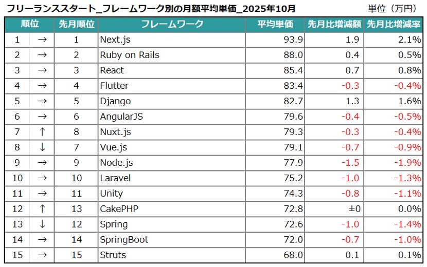 フレームワーク別の月額平均単価(上位15位)を見ると、1位の「Next.js」が93.9万円と先月から単価をあげており、フロントエンド開発における需要の高さを示しています(+1.9万円/2.1%増)。また、AI関連開発のバックエンドとして注目される5位の「Django」も堅調な動きを見せており、専門分野での需要がうかがえます(+1.3万円/1.6%増)。このように、モダンなWeb開発を牽引する技術や、成長分野で強みを持つ技術が高い評価を維持する傾向にあります。