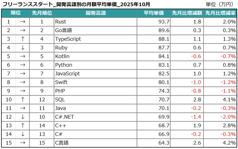 2025年10月度 フリーランスエンジニア月額平均単価78.3万円。開発言語別では「Rust」の平均単価が6ヵ月連続上昇