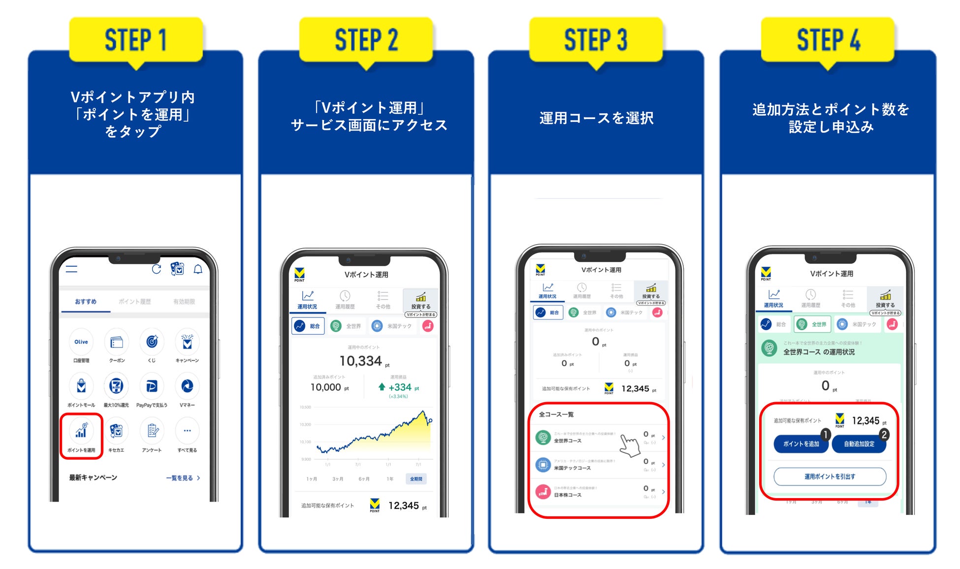 スマートフォンのVポイントアプリから、Vポイント1ポイントから1ポイント単位でお好きな運用コースをお申し込みができます。 ※ スマートフォン限定サービスのため、PCではご利用いただけません。 |