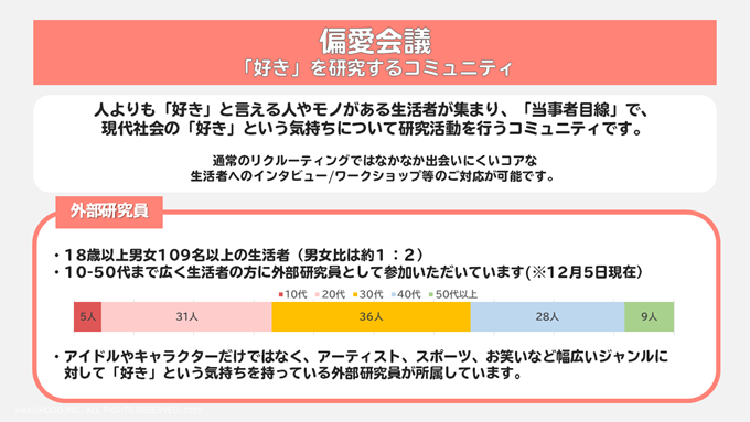 発想技研の研究員と外部研究員(アイドル、音楽、アニメ、キャラクター、スポーツなど様々なジャンルにおいて強い「好き」を持つ生活者)との協働による、推し活などの生活者の強い「好き」にまつわる行動の実態やその背景にある意識についての当事者目線での研究・発信