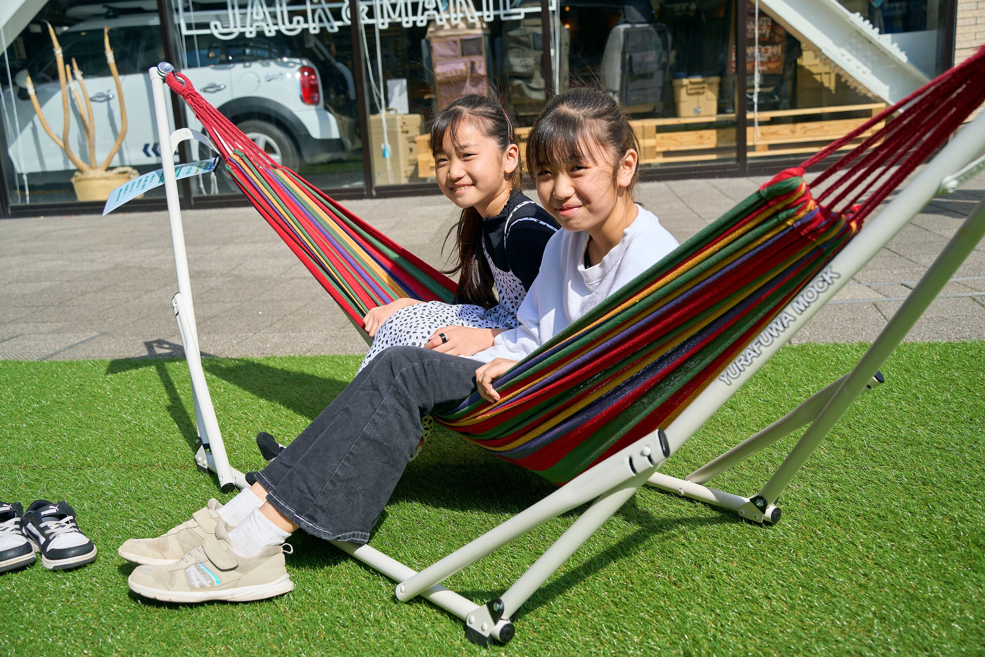 人工芝生エリアにハンモックを設置し、のんびり過ごすことができます