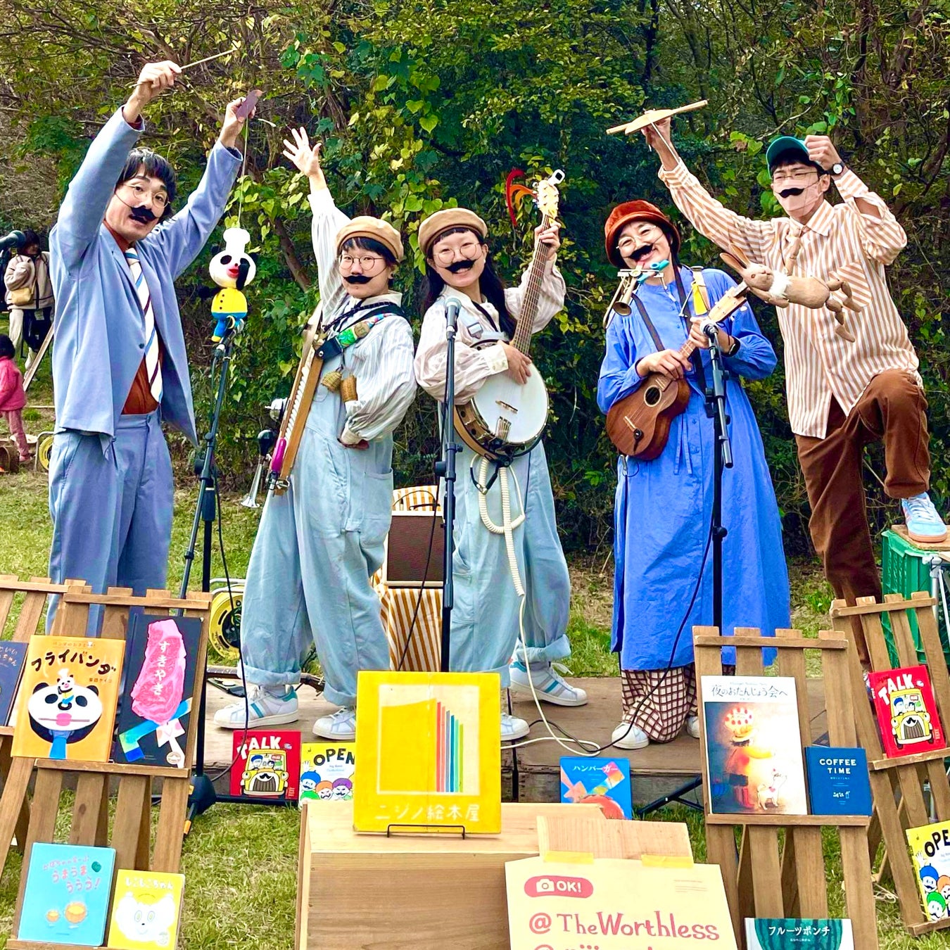 歌うひげと踊るマリオネットのジャグバンド「TheWorthless(ザ・ワ―スレス)」による、楽器を演奏しながらの映画のような絵本の読み聞かせを行います