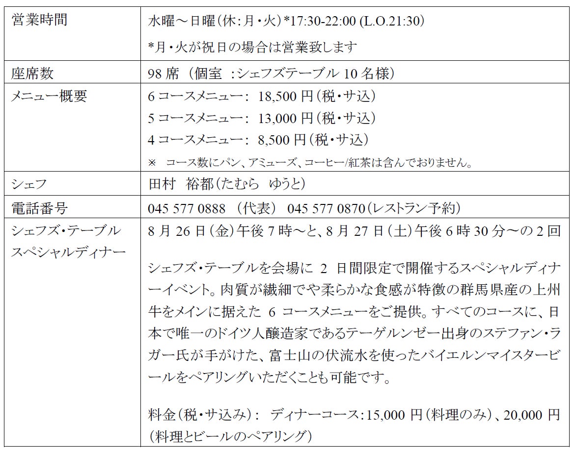 また、レストランには会食や小規模なパーティーにもご利用いただける、シェフズテーブルを併設しております(全10席)。グリルカウンターをダイニングテーブルの真横に配し、シェフの見事な手捌きで食材が調理される様子を間近にご体感いただきながら、お食事をお楽しみいただけます。レストランの開業を記念し、こちらのシェフズ・テーブルを会場とした、2日間限定のスペシャルディナーイベントも今月末に開催の予定です。