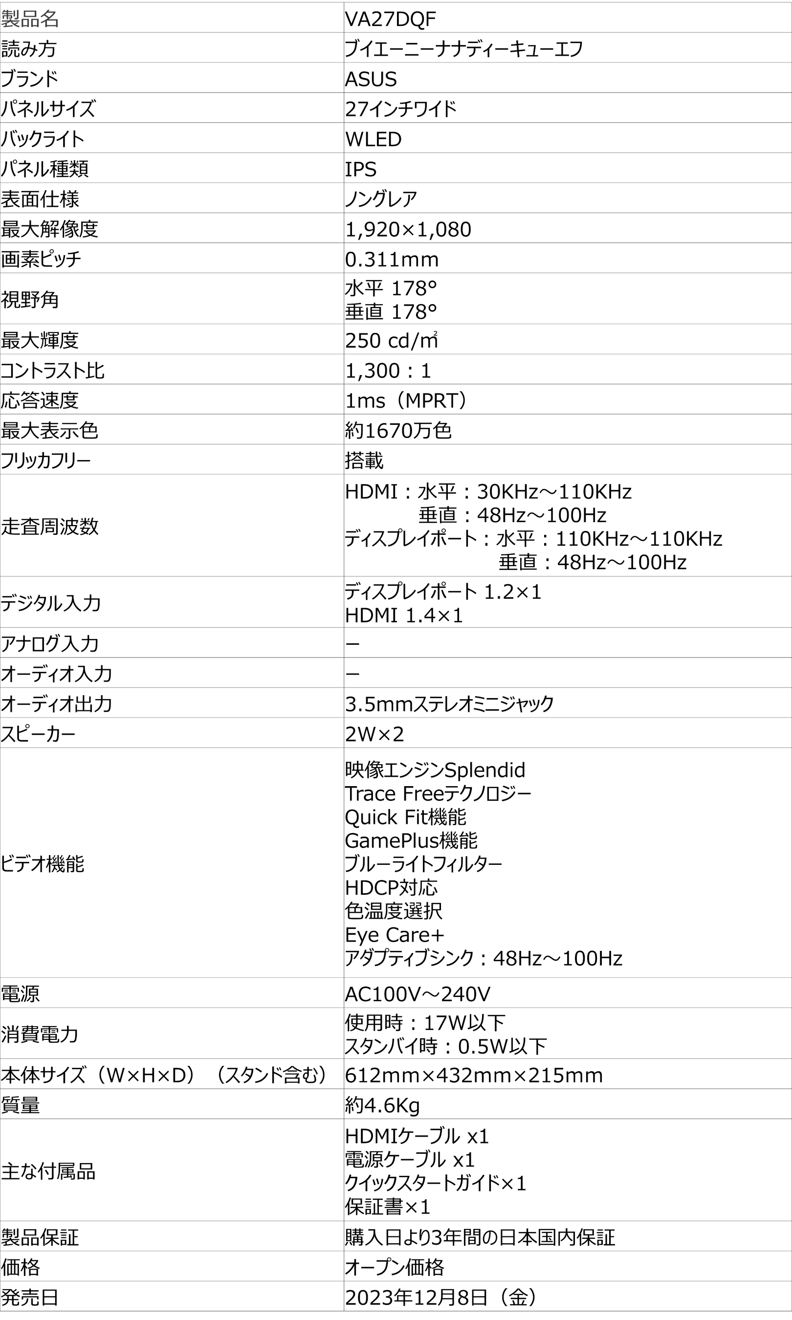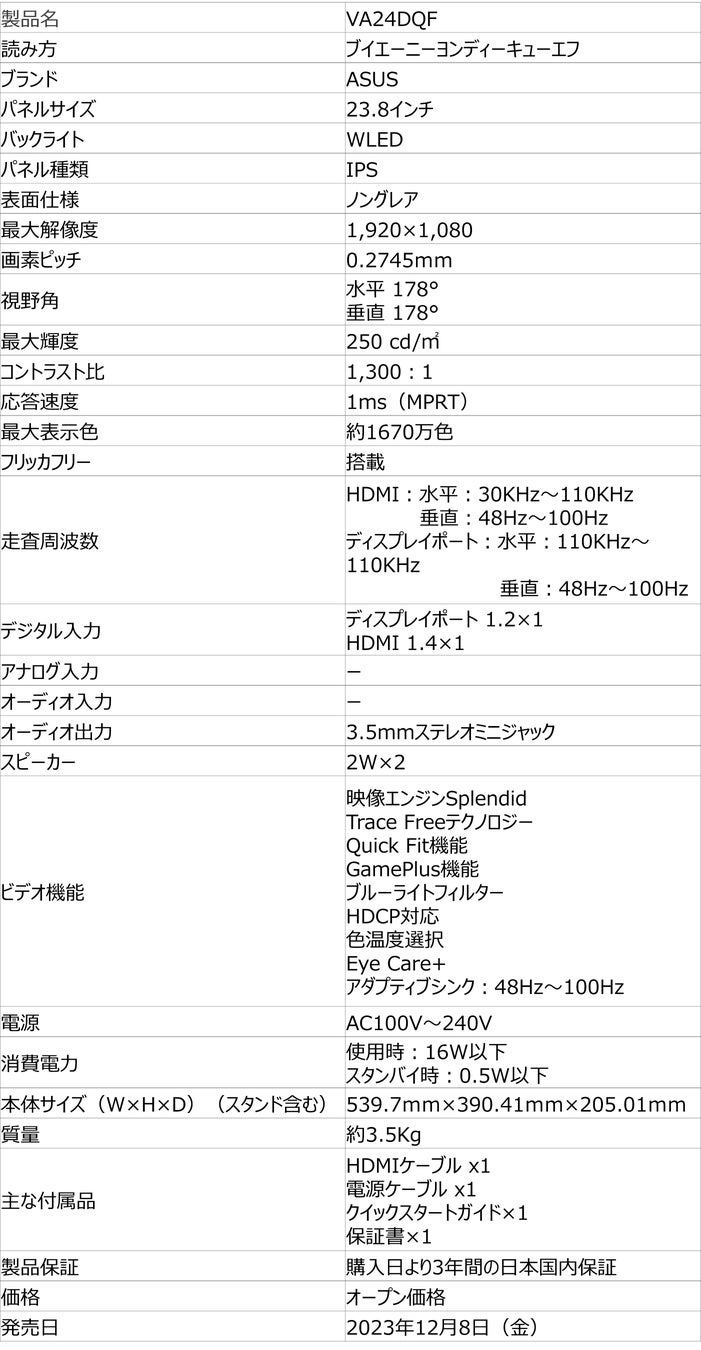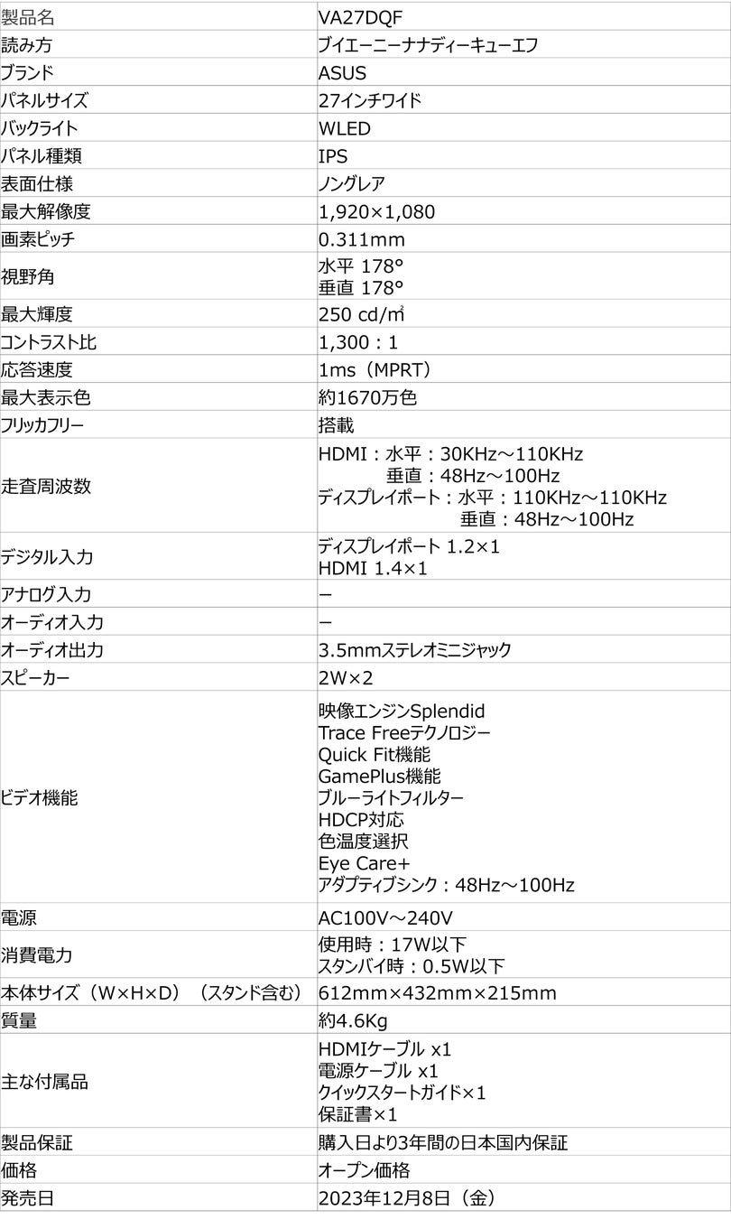 ASUSより100Hzのリフレッシュレートと1msのMPRTに対応したモニター「VA24DQF」「VA27DQF」を販路限定で発売