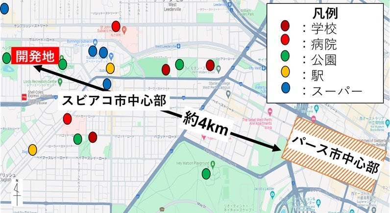 スビアコ市は、西豪州の州都であるパース市の中心部から約4キロに位置し、周辺には学校、病院、公園が点在するなど、利便性及び住環境の質が高いエリアです。当事業では、2期に渡り、3棟の分譲マンションの開発を行うことで、社会課題である住宅不足の解消に寄与するとともに、一部をシニア層向けとすることで、高齢化社会にも対応します。