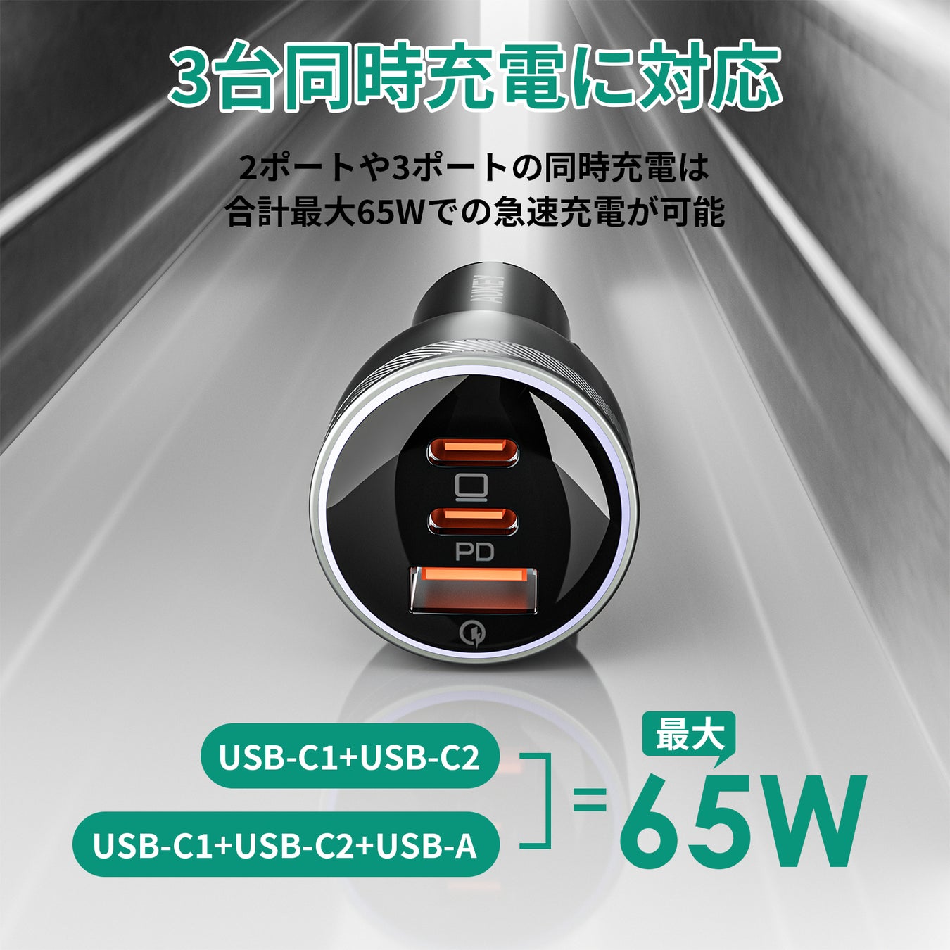 USB-Cを2ポートとUSB-Aを1ポートの合計3ポートを搭載しながらもすっきりデザインで使いやすいカーチャージャー。急速充電規格PD/QCをサポートしUSB-C1ポートを単体で使用時の出力は最大65W。移動中にMacBook Proなどの小型ノートパソコンの急速充電が可能です。快適なカーライフのマストアイテム間違いなし!