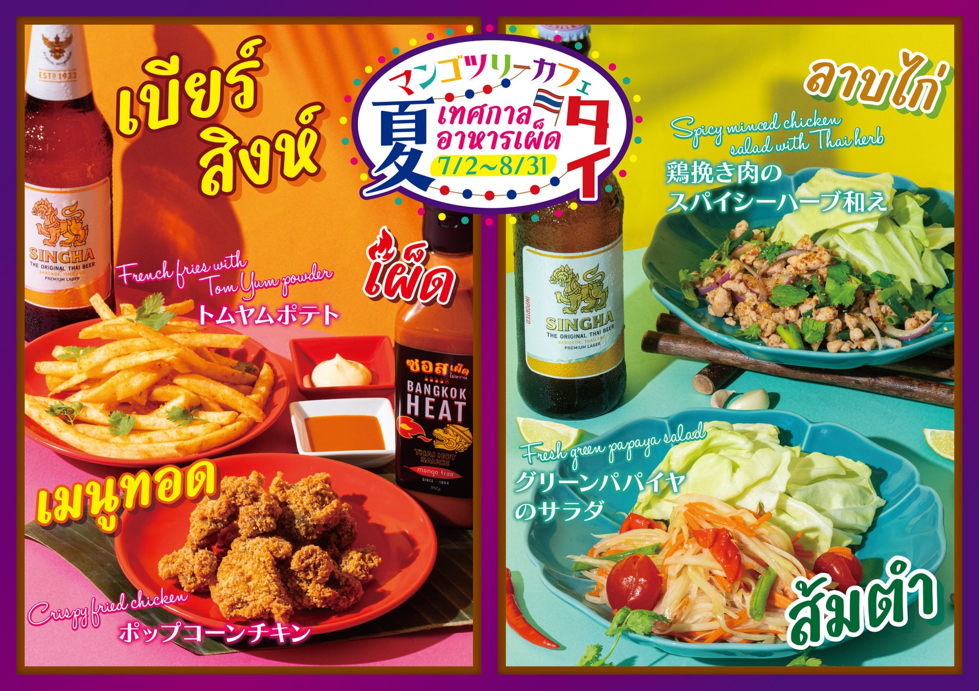 「マンゴツリーカフェの夏祭り」では、これからの季節に相応しいドリンクや、今しか味わえない「トマトのガパオ」が新登場します。さらに、スパイシーなタイ料理を引き立てるタイのプレミアムビール「シンハー」は、いつもよりお得にお楽しみいただけます。