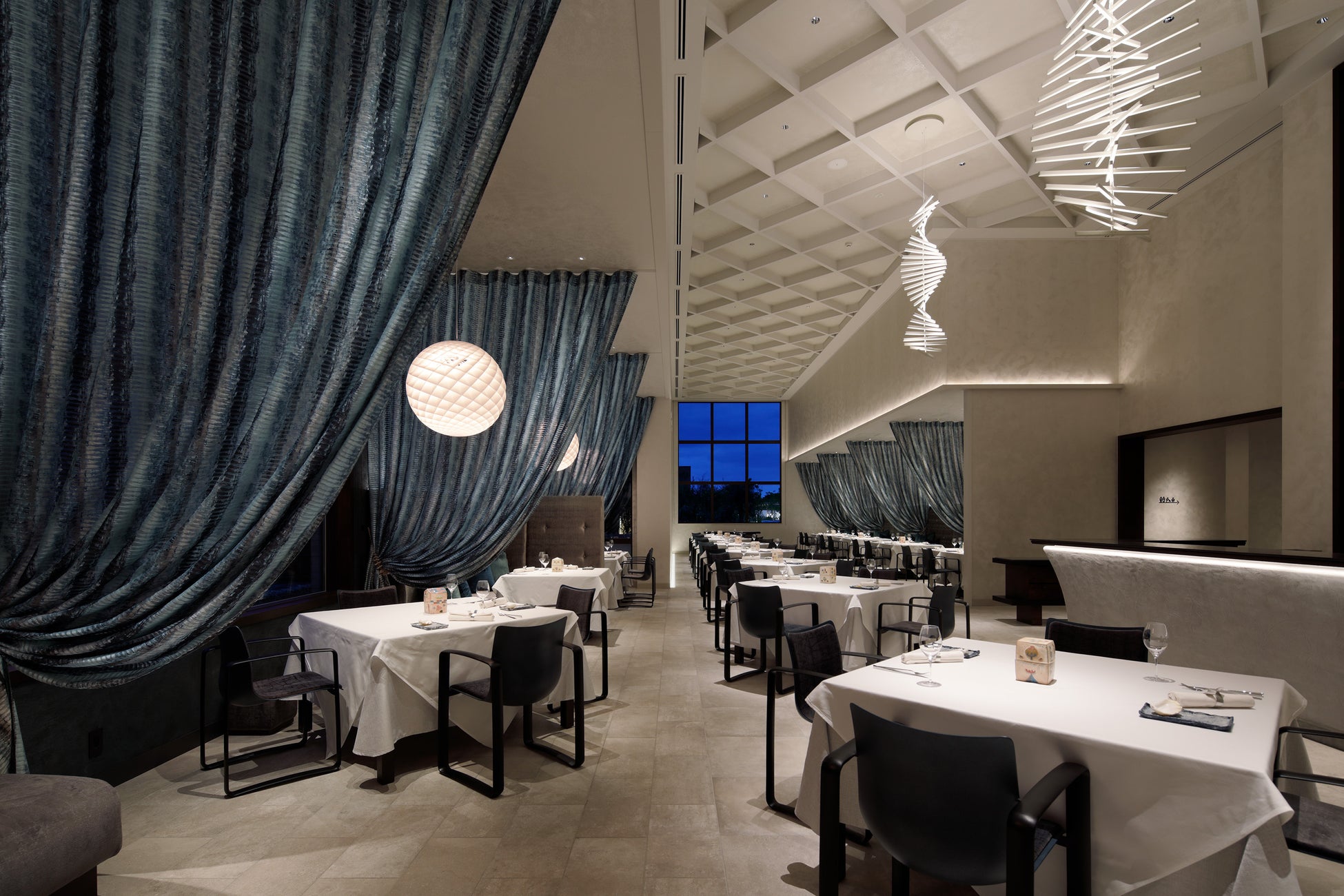 ダイニングは、⾼さ5mの天井が⽣み出す開放的な空間が広がり、海と⽩い砂浜を連想させる⻘と⽩を基調とした内装です。海のすぐ側にありながら窓を全てオープンにせず、海の存在を感じながらもテーブルの上に意識を向ける、食事をゆっくり楽しめる空間です。