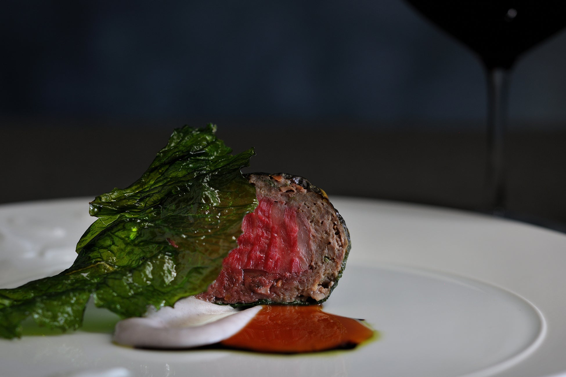 滋養効果が高い山羊肉は、沖縄で薬膳として親しまれています。肉料理のメインディッシュ「牛フィレ肉と山羊肉のインボルティーニ」では、たっぷりの薬味と一緒に味わう土地の文化になぞって山羊肉をショウガ、ニンニク、フーチバー(ヨモギ)のペーストとあわせてミンチにしました。山羊肉のミンチで牛フィレ肉のブロックを包み、シマナーと呼ばれるカラシナでくるりと巻いて「インボルティーニ」に仕立てています。ソースには、カリウムや鉄分が豊富な田芋のピュレと塩分を抑えた久米島味噌をあわせたクリアなブロードソースを添えて滋味あふれる味わいに。しっとりとした牛肉とミルキーな風味の山羊肉に香味野菜が旨味を引き立てます。