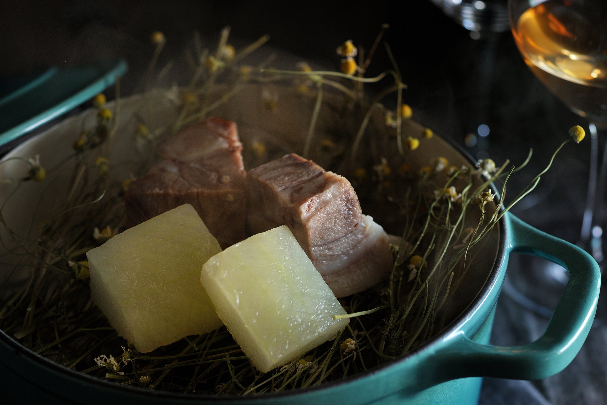 コースではペアリングワインからインスピレーションを得た料理も登場します。カモミールを感じるオレンジワインには、温前菜「豚肉のカモミール蒸し」をペアリング。カモミールで蒸しあげた肩ロース肉と冬瓜に注ぎ入れるブロードにもカモミールの香りを添えて、心安らぐウッディーでフローラルな香りが広がります。肩ロース肉はたんぱく質と脂質のバランスが良く、冬瓜はカリウムやビタミンCが豊富です。コンディメントの「モスタルダ(*)」には、沖縄の柑橘「タンカン」を使い、爽やかな甘みが楽しめます。