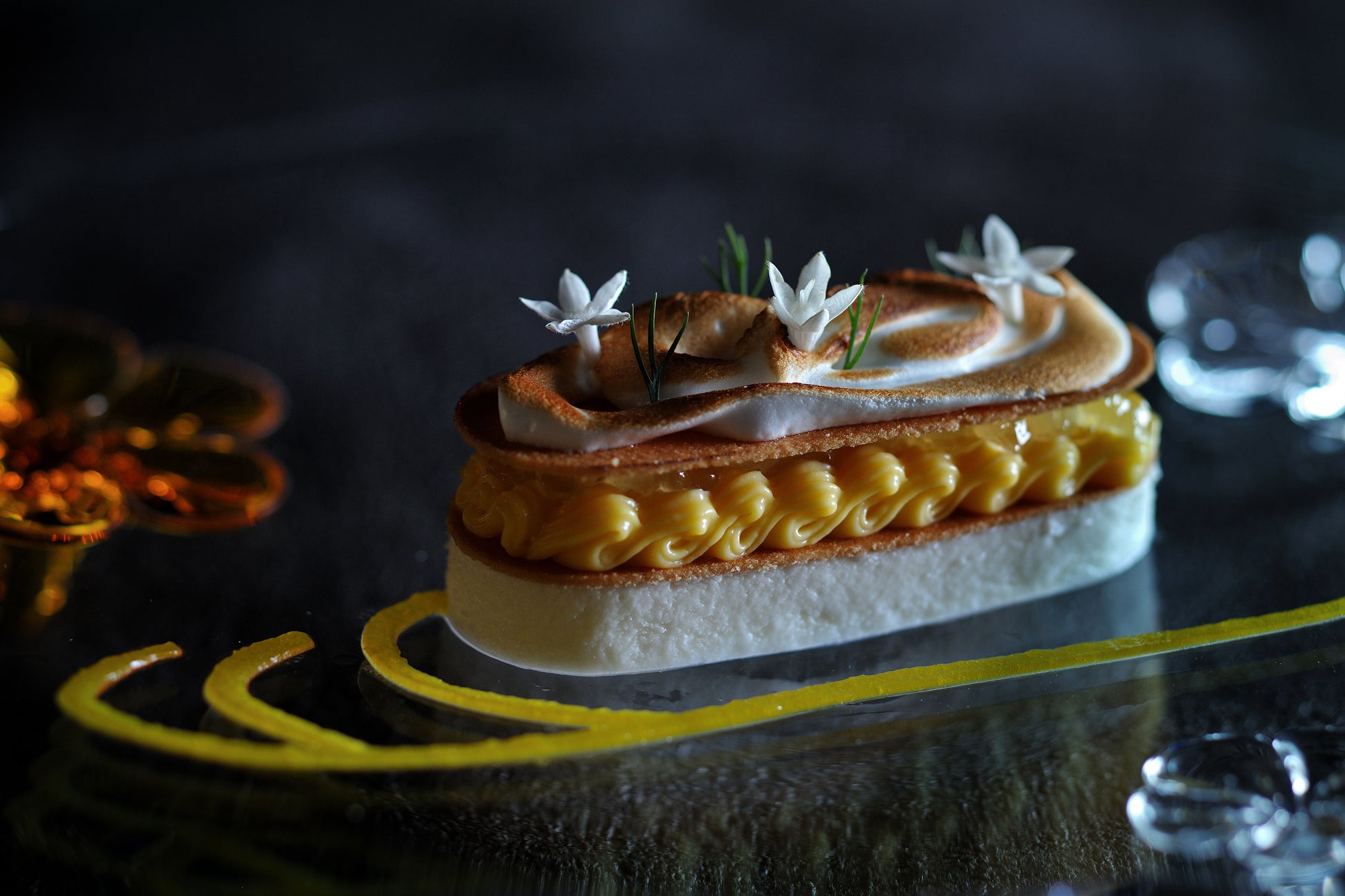 タンカンをあわせた色鮮やかなクリームは、紅型の古典柄「流水型」に流し、シークヮーサーの香りを移したメレンゲとリコッタチーズのムース、ディルのアイスで挟みました。タンカンの濃厚な甘さとジューシーな味わいに爽やかな香りも楽しめます。