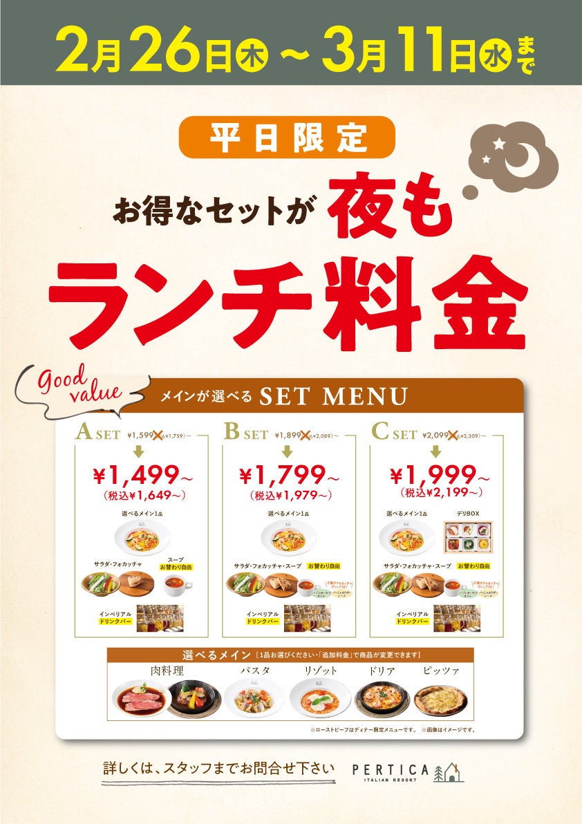 【イタリアン リゾート ペルティカ 鶴川】平日はお得なセットが“夜もランチ料金”でお楽しみいただけます!ぜひこの機会に五感をくすぐるイタリアンでお得に至福のディナーをお楽しみください。