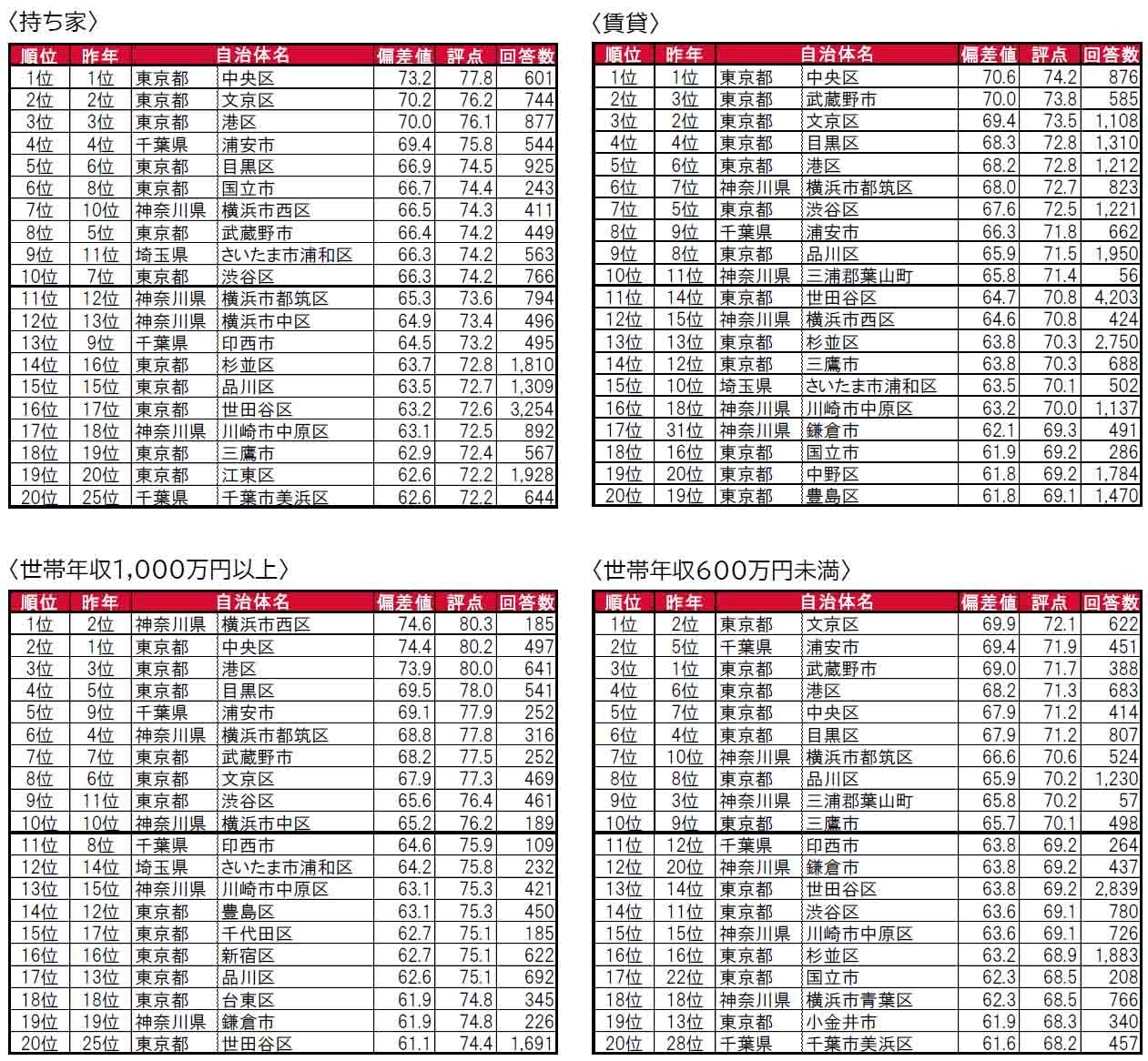 街の住みここちランキング2024<首都圏版>自治体(住居形態・世帯年収別)TOP20