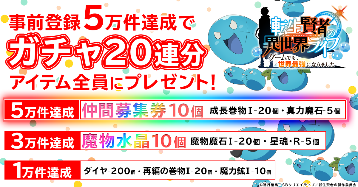 事前登録の参加人数に応じて、サービス開始時に豪華アイテムを全員にプレゼントいたします。事前登録数の合計が5万件達成で20連分のガチャアイテムをプレゼント!