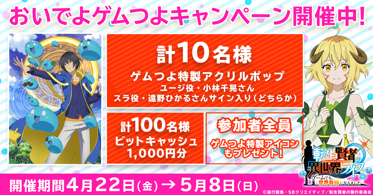 事前登録開始を記念して、「ゲムつよ」公式Twitter内にてフォロー&RTキャンペーンを開催中です。抽選でキャストサイン入りのグッズやビットキャッシュなど豪華賞品があたります。また、参加者全員に限定アイコンのプレゼントも行っておりますので、ぜひキャンペーンにご参加ください。