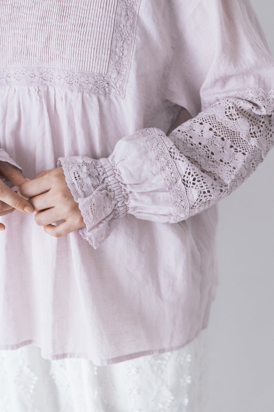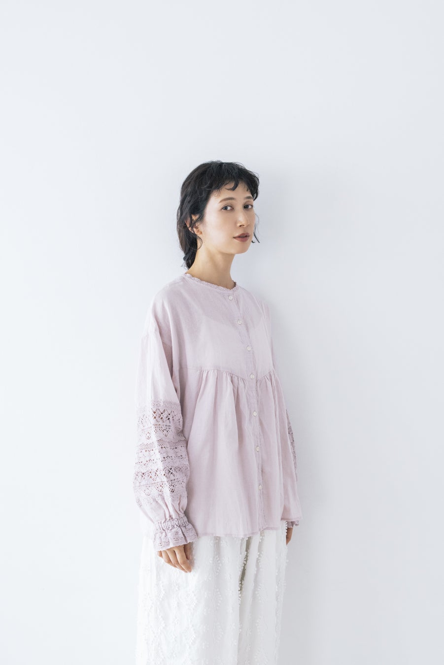 袖の一部を軽やかでシアー感のあるレースで切り替えた綿麻ブラウス。