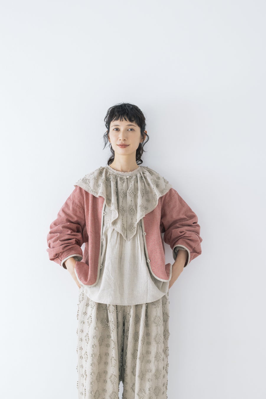 ブラウス感覚で重ね着がしやすい綿麻素材のジャケットは、ギンガムチェックと無地のリバーシブルで着回し力抜群。初の試みとして取り入れた3D刺繍の襟は、お手持ちのTシャツやブラウスに付け替えてアレンジも楽しめます。