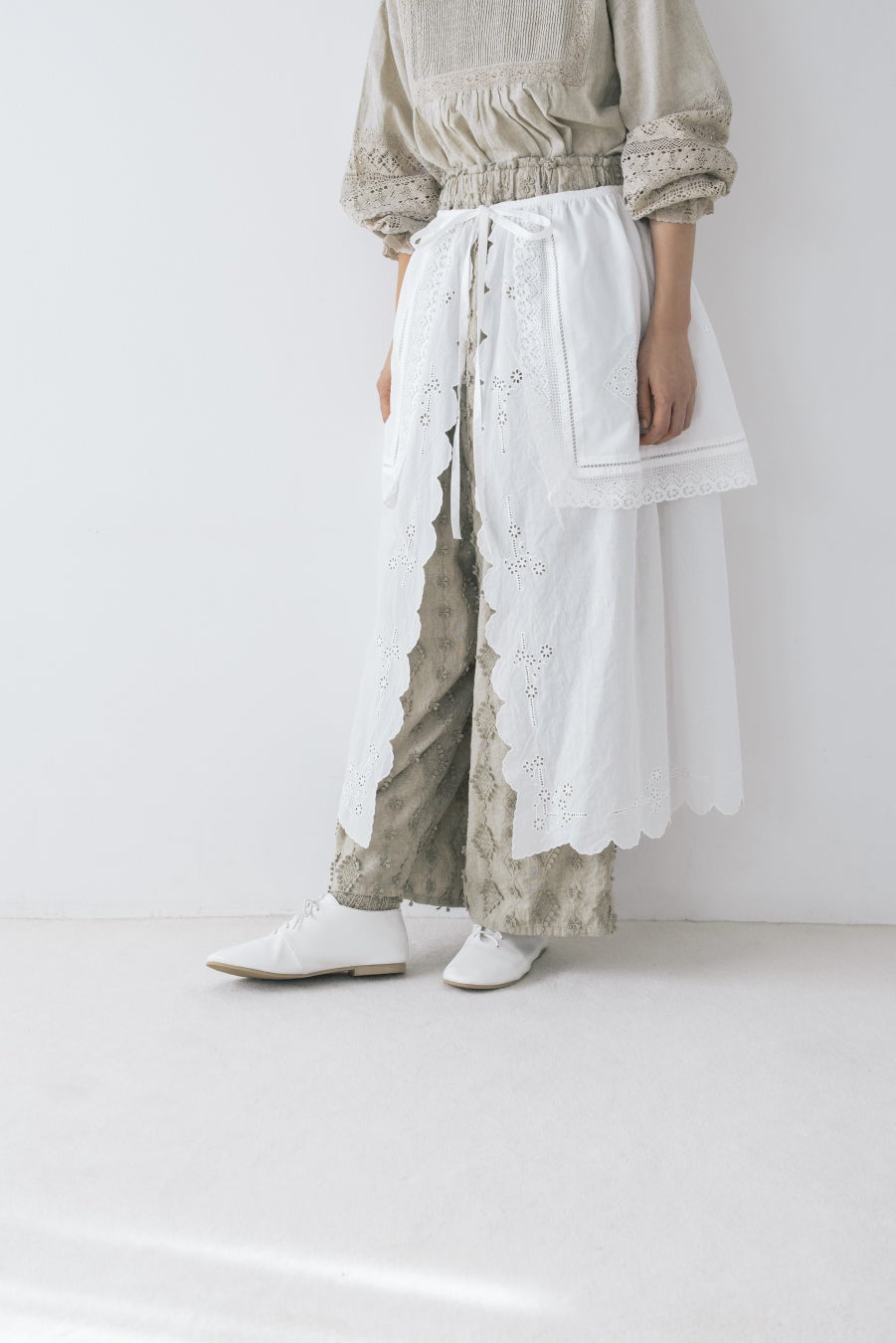 アンティークエプロンから着想を得て、レースの柄や配置、重ね具合を細かく調整して作りました。付属のポケット付きペチスカート以外に、コラボのパンツやお手持ちのデニムに巻いて、遊び心のあるスタイリングをお楽しみいただけます。