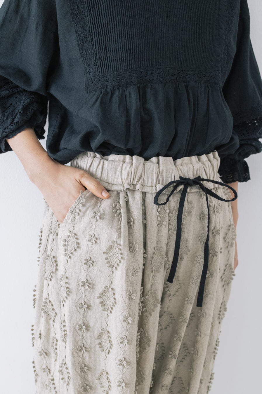 また、前作でご好評いただいた、ウエスト部分を折り返すだけで簡単に丈調節ができるストレートパンツも、立体的な刺繍をあしらいアップデート。リラックス感がありながらも、履くだけでサマになるデザインに仕上げました。