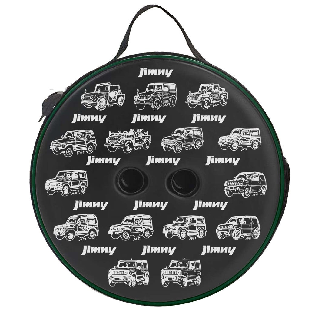 歴代の「JIMNY」のイラストが座面にデザインされた「折りたたみスツール」の本製品は、アウトドアやイベントなどにぴったりの持ち運び対応ができる便利なイスです。