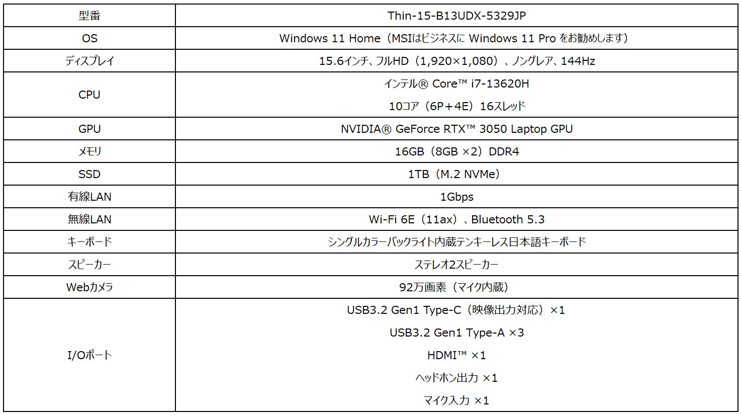 【Thin-15-B13UDX-5329JPの主な特徴】