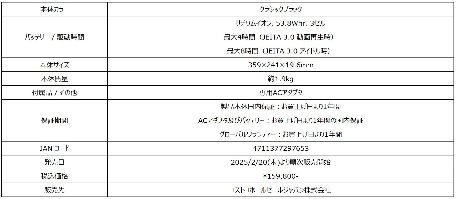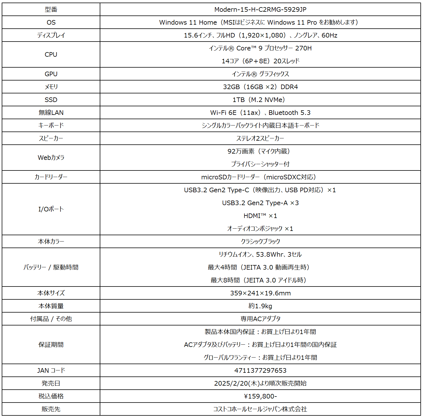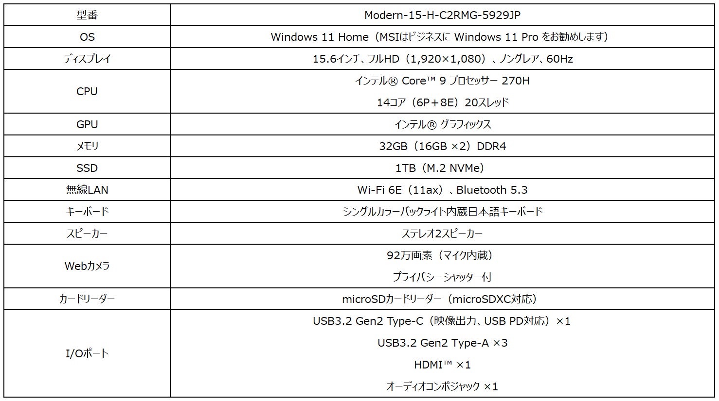 また、「“軽さ”ではなく“速さ”」を重視したハイスペックビジネスノートPCのコストコ限定モデル「Modern-15-H-C2RMG-5929JP」も同時発売いたします。