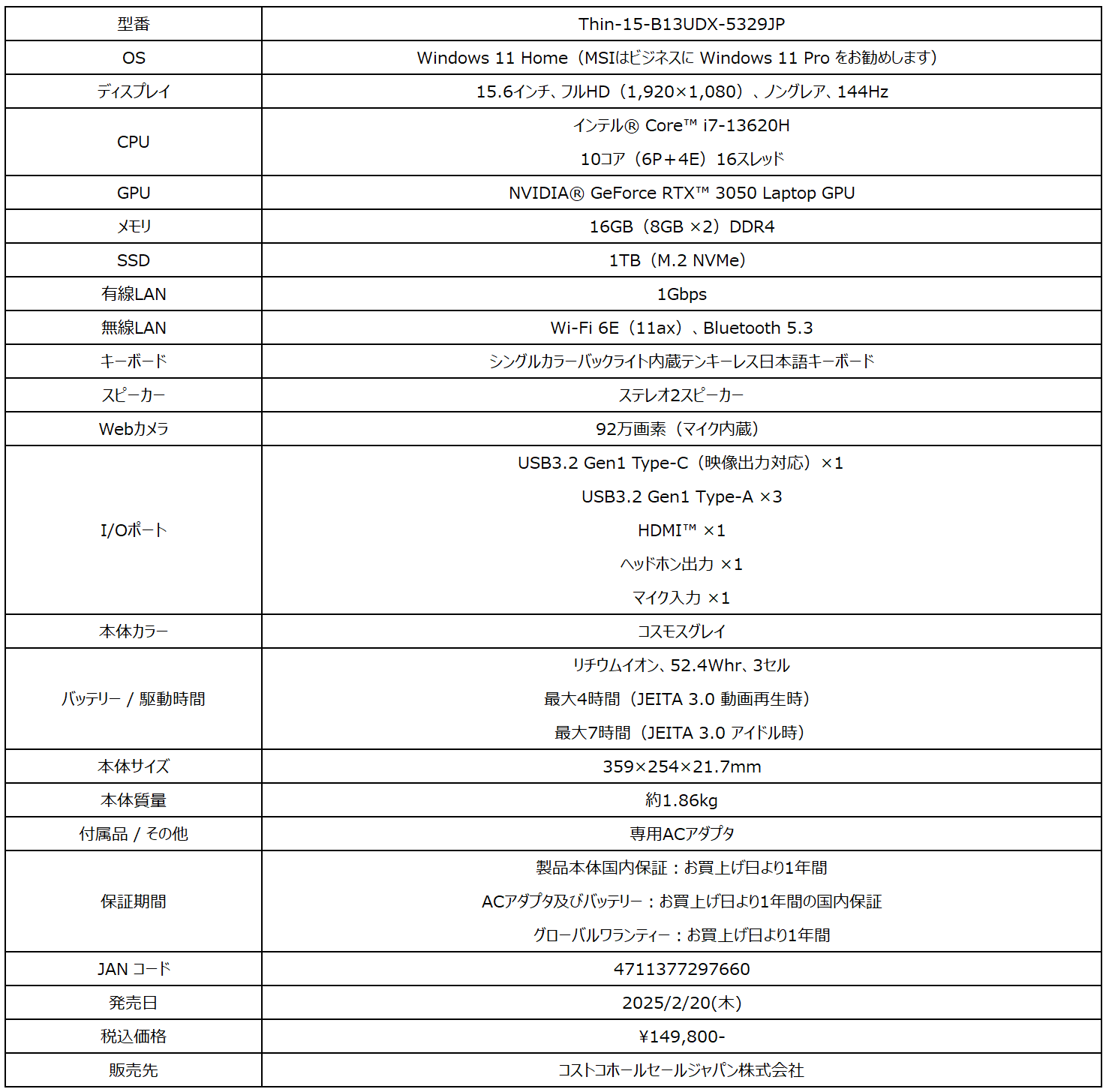 この度、エムエスアイコンピュータージャパン株式会社は、薄さ21.7mm・軽さ1.86kgの薄型・軽量デザインの本体に「GeForce RTX™ 3050 Laptop GPU」を搭載し、いつでもすぐにゲームが遊べる15.6インチゲーミングノートPC「Thin 15 B13U」シリーズのコストコ限定モデル「Thin-15-B13UDX-5329JP」を2025年2月20日(木)より発売いたします。