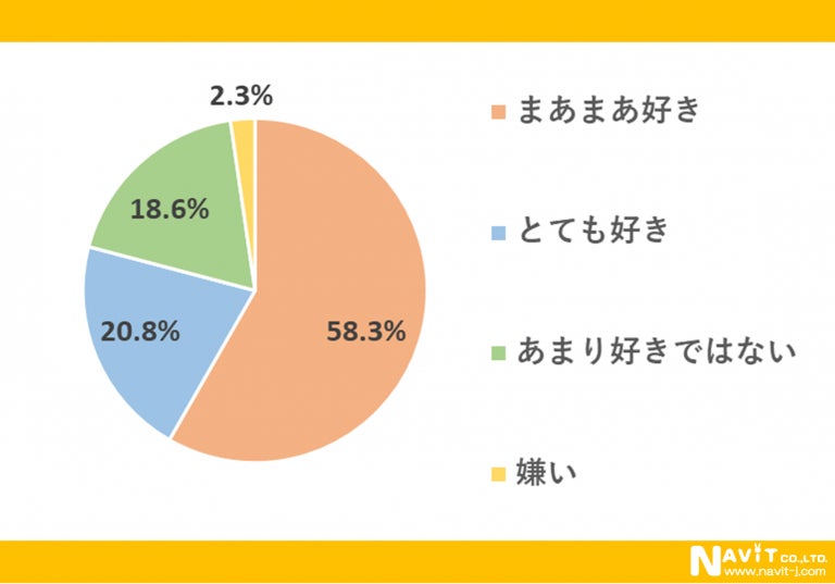「かき氷は好きですか?」の質問については、「まあまあ好き」が58.3%、「とても好き」が20.8%、「あまり好きではない」が18.6%という順になり、「まあまあ好き」「とても好き」を合わせると79.1%の人が、かき氷を好きということが分かりました。
