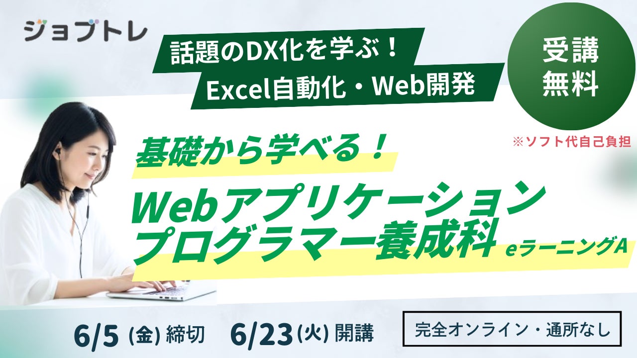 【Excel自動化 × Webアプリ開発】プログラミングが学べる求職者支援訓練「基礎から学べる!Webアプリケーションプログラマー養成科(eラーニングA)」6/23開講!受講生募集開始