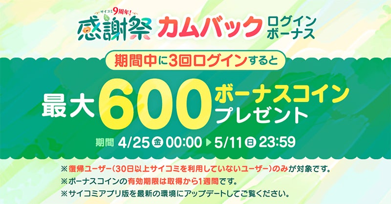 復帰ユーザー(30日以上「サイコミ」を利用していないユーザー)を対象に、期間中3回ログインすることで、最大600ボーナスコインをプレゼントします。