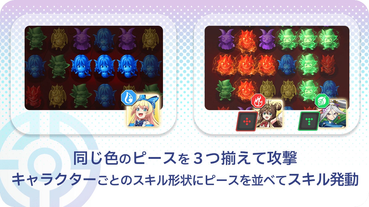 同じ色のピースを縦もしくは横に3つ以上つなげることで、該当のピースの属性(黄色のピースを消した場合は光属性)に該当するキャラクターが攻撃をします。また各キャラの持つスキルには形状をもっており、盤面のピースをスキル形状に配置することでスキルを発動できます。如何に制限時間内にピースを揃えられるかがテクニックの見せどころになります。