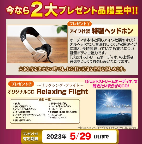 5月29日(月)までのキャンペーン期間中に本商品をご購入いただくと、期間限定2大プレゼントアイワ社製「特製ヘッドホン」とオリジナルCD「Relaxing Flight(リラクシング・フライト)」を贈呈いたします。