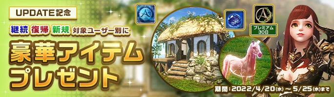 また、『アーキエイジ』を「現在プレイされている方」「久しぶりにプレイされる方」「初めてプレイされる方」別に冒険に役立つアイテムをプレゼントするイベント「豪華アイテムプレゼント」を開催いたしました。