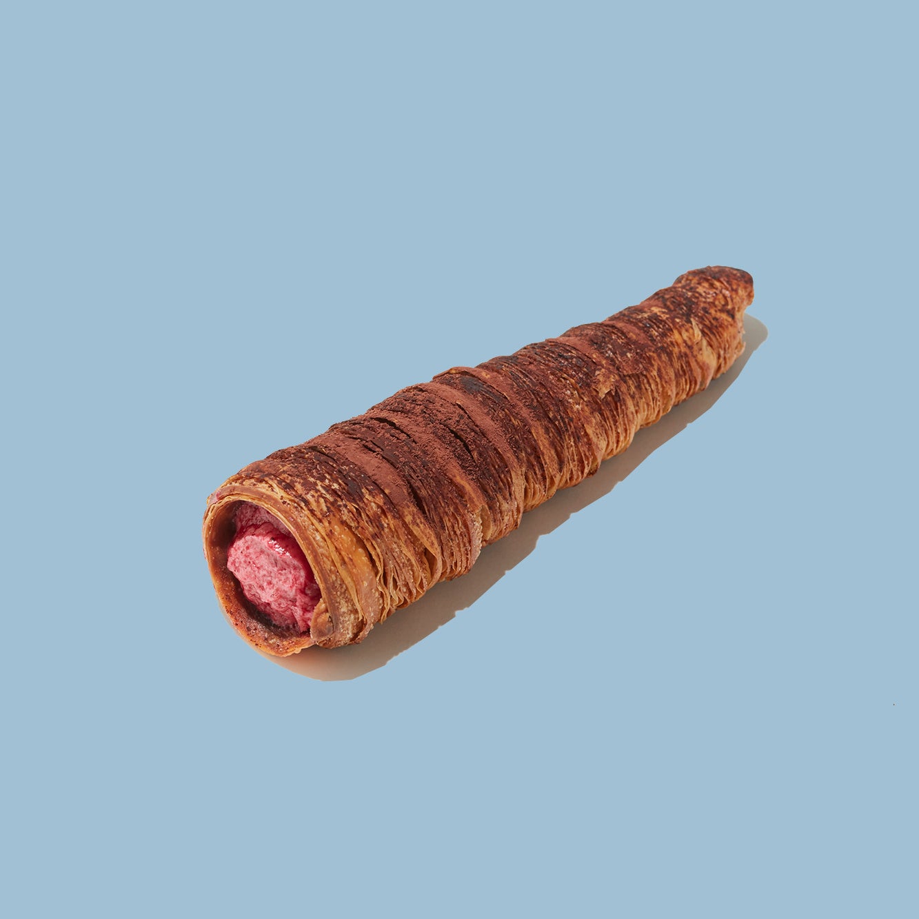クロワッサンを筒状にした生地に自家製ホワイトチョコ&ラズベリーミルククリーム入り。