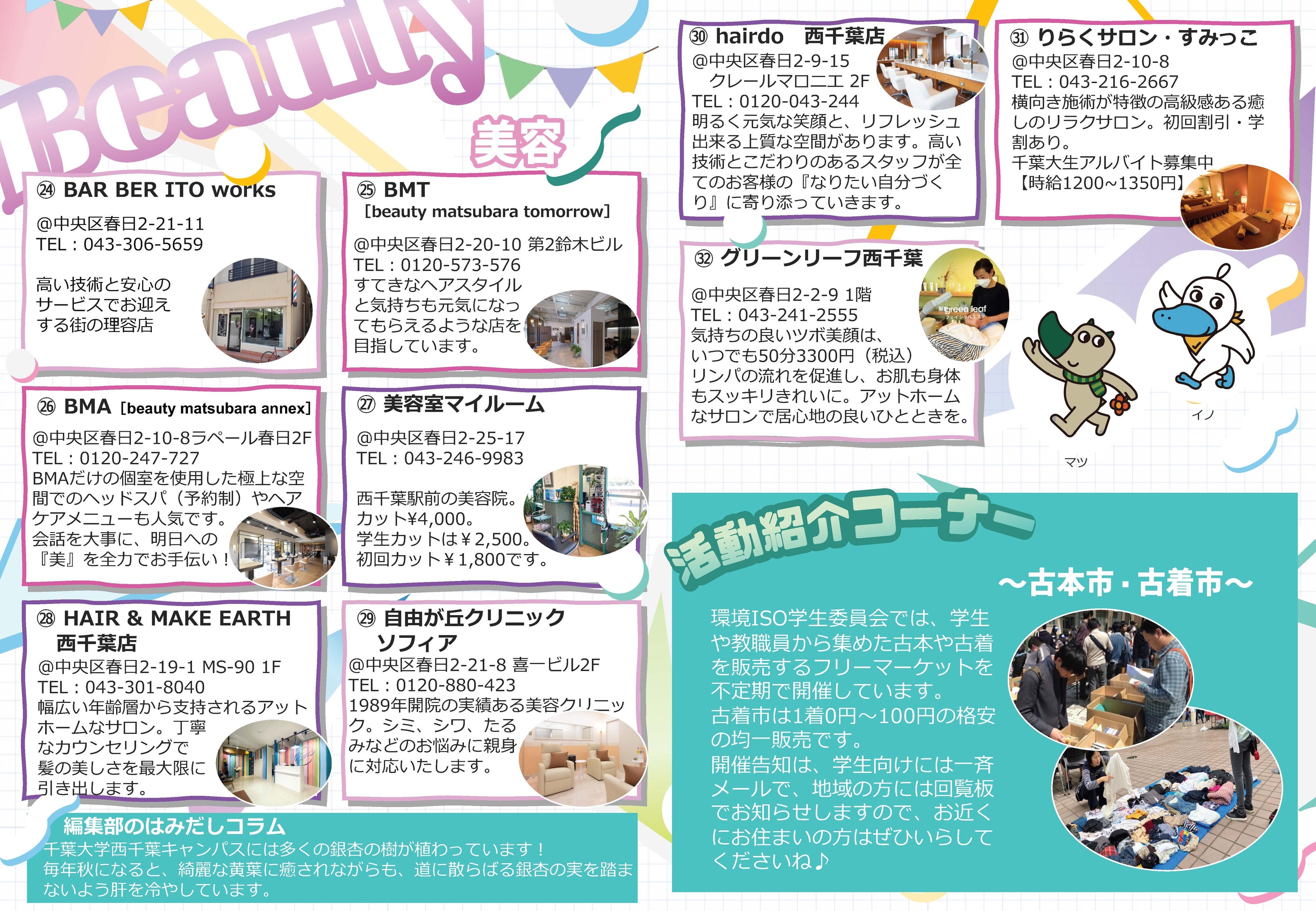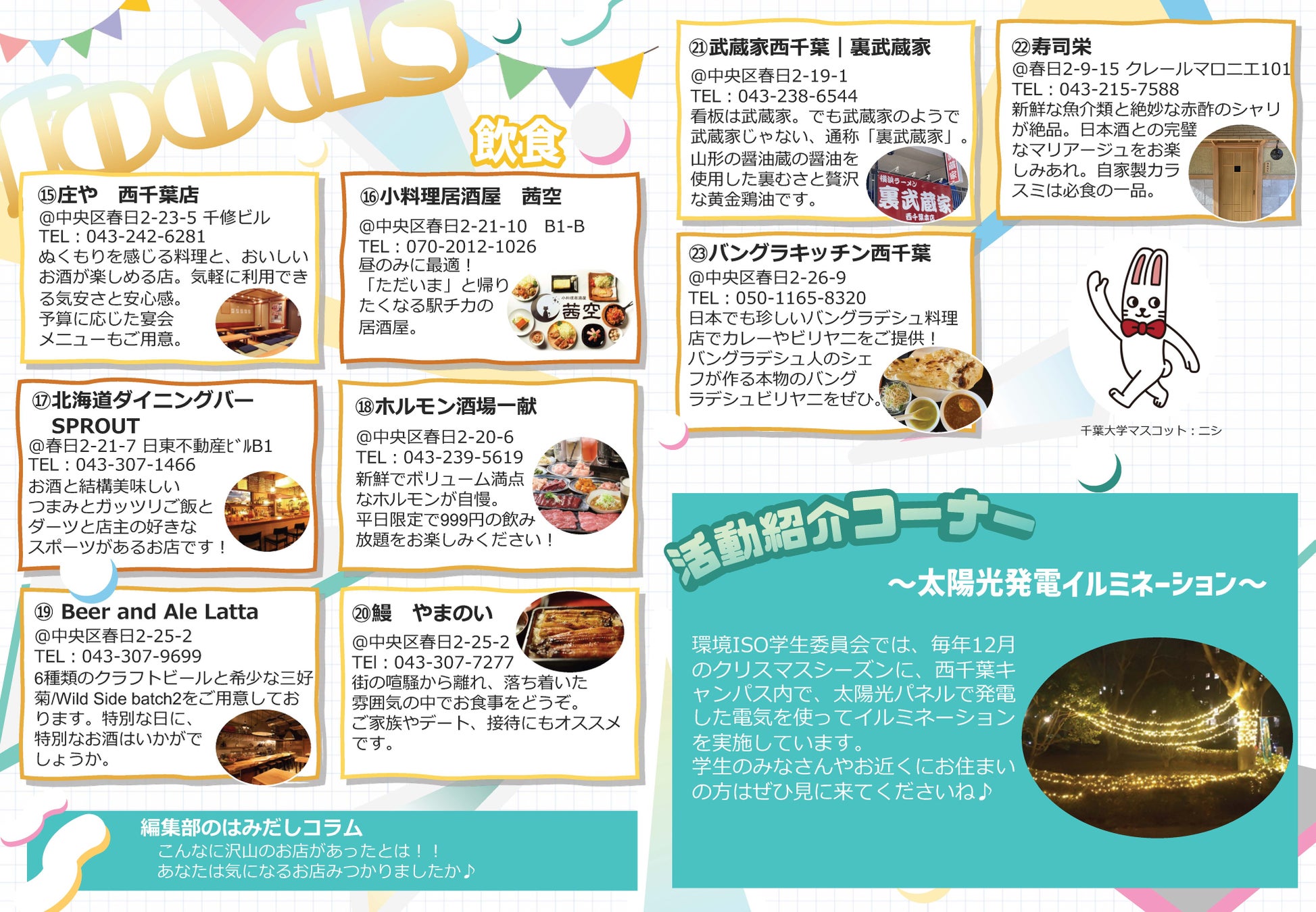 本冊子では、西千葉マロニエ商店会に加盟する飲食店をはじめ、生活関連店舗、美容、医療、教育施設など、幅広いジャンルの店舗情報を掲載しています。「知っているようで知らなかった西千葉」を再発見できる内容となっているほか、環境ISO学生委員会の環境活動の紹介や、エコ工作コラム、エコクロスワードなども盛り込んでいます。