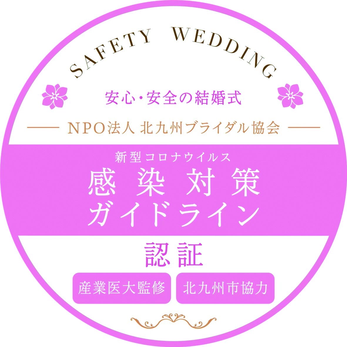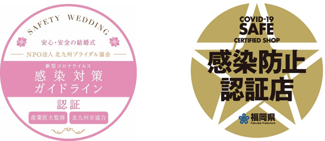 ①NPO法人北九州ブライダル協会により産業医科大学及び北九州市の協力を得て制定された「結婚式における新型 コロナウイルス感染対策ガイドライン」にもとづく認証審査により認証マークを交付いただきました。当ホテルはガイドラインに沿って、感染対策を徹底し、安心安全の空間をご提供いたします。