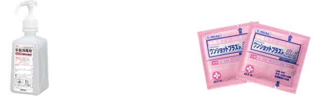 ①1テーブル1台消毒液設置サービス ②1名様2枚ワンショット綿無料配布