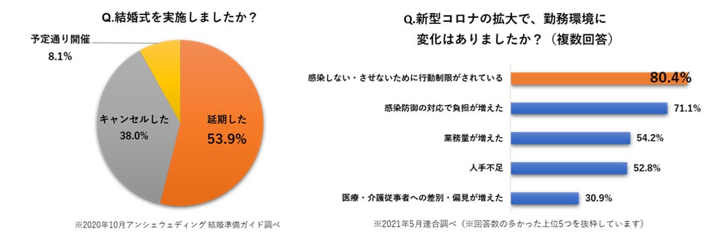 2020年春以降、コロナ禍で大多数のカップルが結婚式の延期やキャンセル、規模縮小を余儀なくされる状況が続いています。アンシェウェディング結婚準備ガイドの調査では、2020年時点で結婚式を予定していたカップルのうち、約9割が延期・キャンセルを決断(次頁左図)。現在はwithコロナ時代に突入し、少人数婚や家族婚、フォトウエディングなど新たな結婚様式が定着しつつありますが、その中でも開催のハードルが高くなってしまっている方々がいらっしゃいます。それが医療従事者の皆様です。日本労働組合総連合会が2021年に実施したアンケート結果によると、新型コロナウイルス感染拡大の中で、医療従事者の皆様が一番実感している勤務環境の変化が「感染しない・させないために行動制限がされている」ということです(次頁右図)。当ホテルでは、勤務時に加えて日常生活から感染対策にご尽力されている医療従事者の皆様に感謝の気持ちを込めて、安心安全な会場づくりからお手伝いをしたいと思い、本プランの企画に至りました。