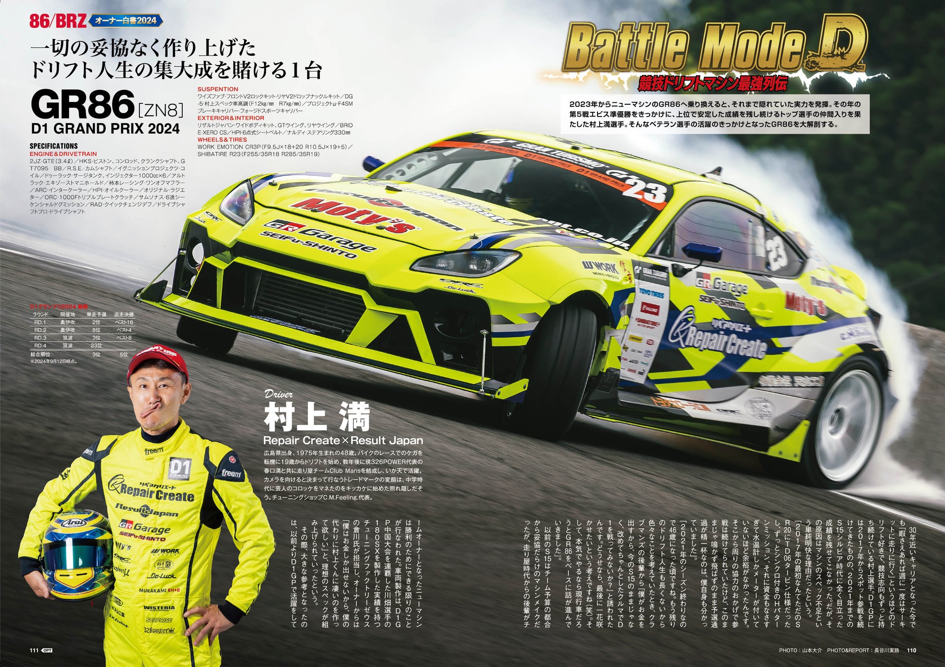 競技スペックのドリフトマシンのスペックをチェックする『Battle Mode D』。連載9回目は、S15シルビアからGR86にマシンをスイッチし、D1GPを戦う村上満選手の愛機に迫る。
