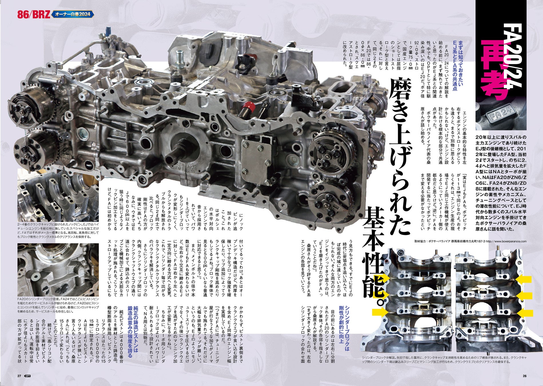 排気量こそ異なるものの、Z♯6、Z♯8ともに搭載するのはスバル製の水平対向4気筒NAユニットだ。そこで、EJ時代から数多くの水平対向エンジンを手掛けてきたボクサーパラノイア桑原氏が、チューニングベースとしての潜在性能を語ってもらった。また、独自のリビルトエンジン製作を手掛けるオートサービスカンキの取り組みにも注目する。