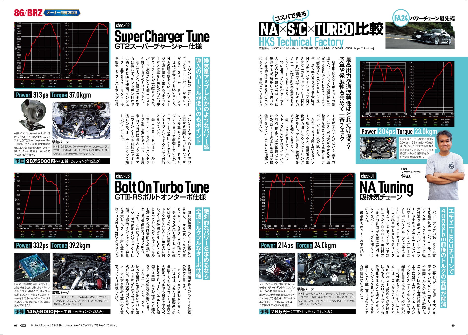 HKSからボルトオンターボキットが登場したことを受けて、いよいよ本格化するFA24のパワーチューニング。そこで、NA仕様/スーパーチャージャー仕様/ターボ仕様…と、それぞれ使用パーツと装着に掛かるコストを照らし合わせながら、参考のシャシダイグラフをチェックする。