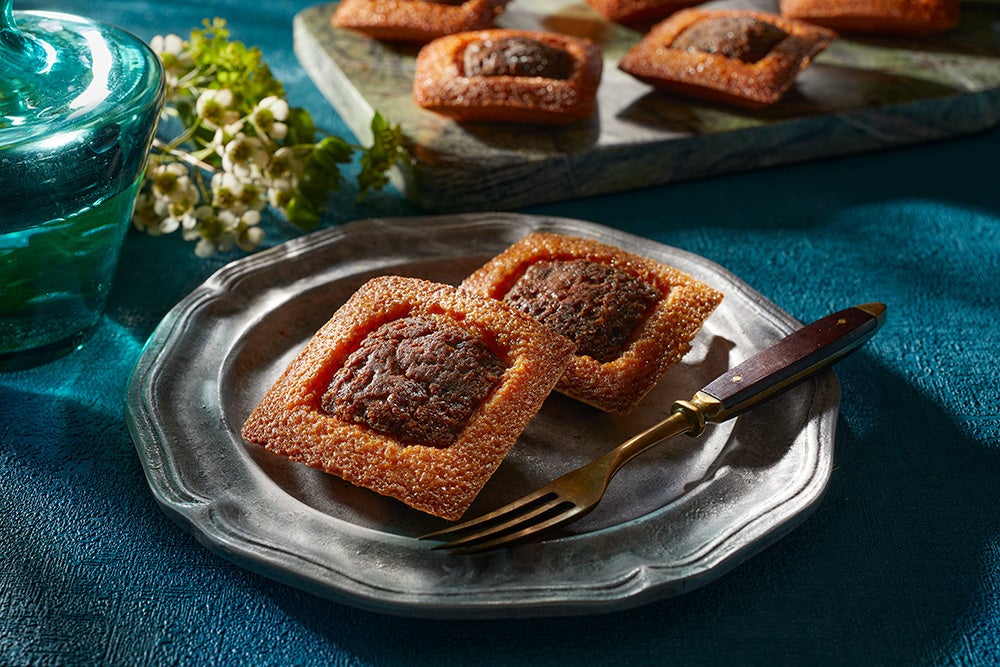 北海道発酵バターと香り高いスペイン産アーモンドを使ったバターフィナンシェ。表面を香ばしく焦がしたブリュレショコラスプレッドを埋め込んで、しっとりとジューシーに仕上げました。