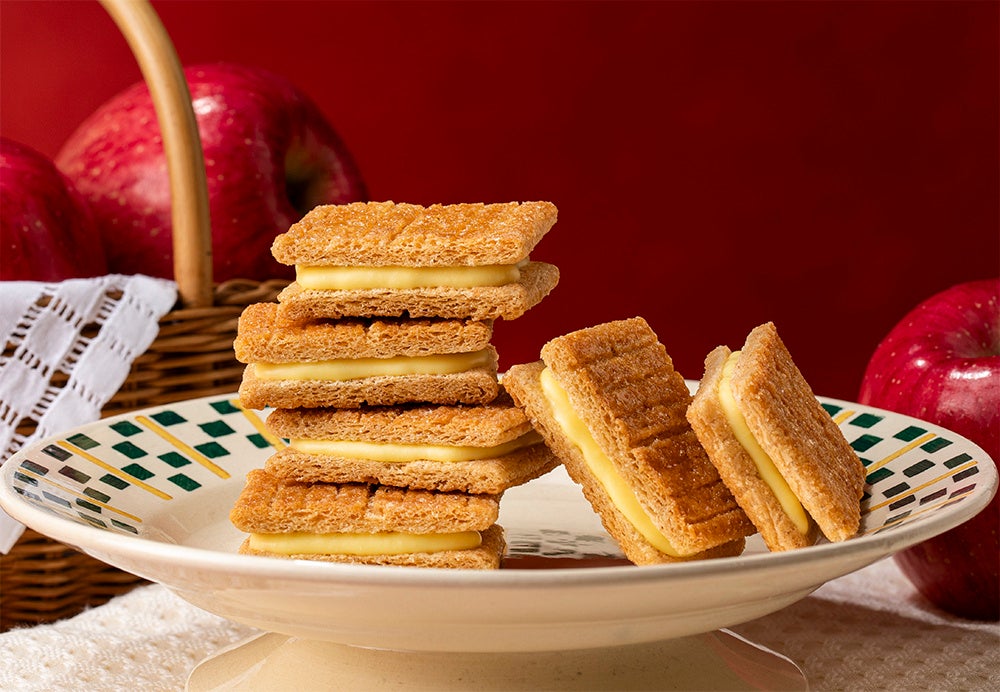 ほろ甘シナモンを加えたりんご香るサクサク生地を パリッとキャラメリゼすれば、まるでアップルパイのようなおいしさに!中には⻘森県産りんごを練り込んだ甘酸っぱいショコラをサンドして、秋冬にぴったりのごちそうサンドに仕上げています。